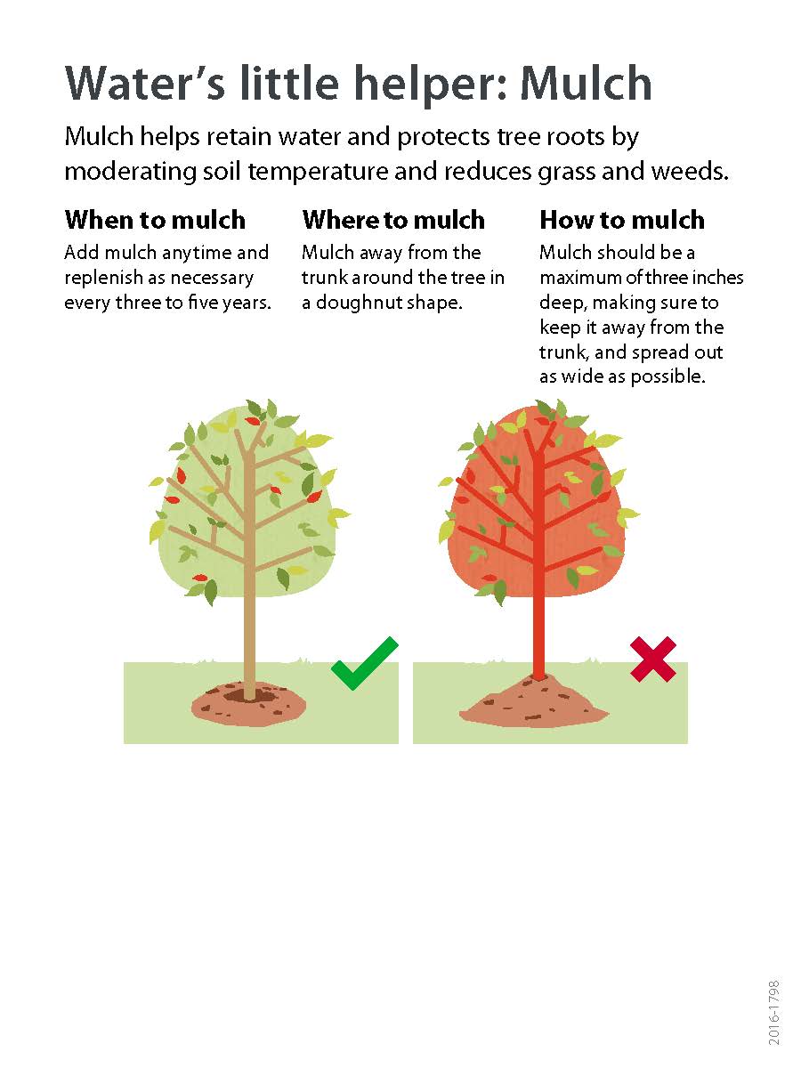 - Add mulch away from the trunk around the tree in a donut shape. See Water’s Little Helper: Mulch for more info on how to properly use mulch.